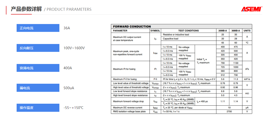 36MB160A单相整流方桥,ASEMI品牌参数规格:电流:36A;电压:1600V;盒装:20PCS/盒。应用于工业中大部分的三相交流用电设备,马达,电焊机,发电机,变频器,通用电磁炉,工业电源控制柜,数控车床,通讯等大型机电设备。