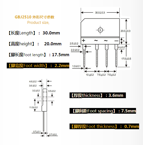 GBJ2510作为一款整流桥不是随便说说而已,这种的产品品质来源于生产实力。GBJ2510用数据说话,产品尺寸规格如下:脚宽度为2.2mm,脚长度为17.5mm,脚间距为7.5mm,本体长度为30.0mm,高度为20.0mm,厚度为3.6mm,脚厚度为0.7mm。