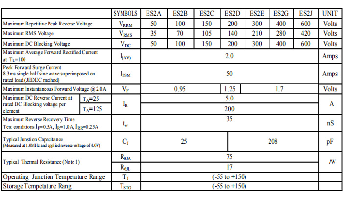 ES2JA的电性参数:最大正向平均电流2A;最大反向峰值电压600V