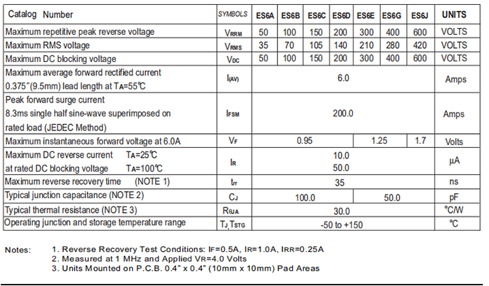 ES6JC的电性参数:最大正向平均电流6A;最大反向峰值电压600V