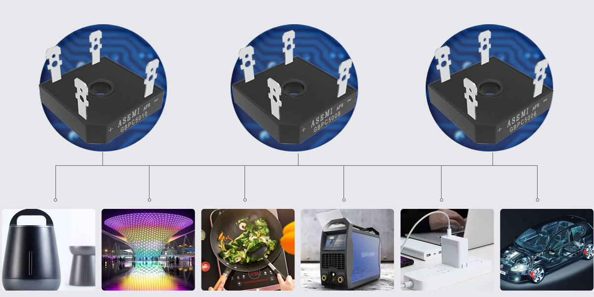 整流桥被广泛适用于:电源、充电器、适配器、LED灯饰、大小家电、民用及工业设备等产品中使用