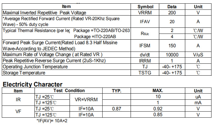MBR20200FCT的电性参数:最大正向平均电流20A;最大反向峰值电压200V