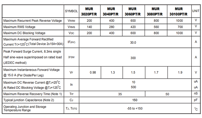 MUR3060PT的电性参数:最大正向平均电流30A;最大反向峰值电压600V
