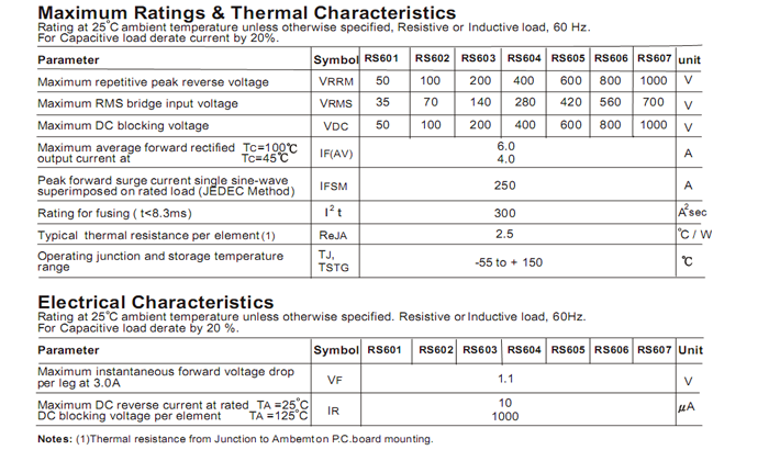 RS607的电性参数:最大正向平均电流6A;最大反向峰值电压1000V